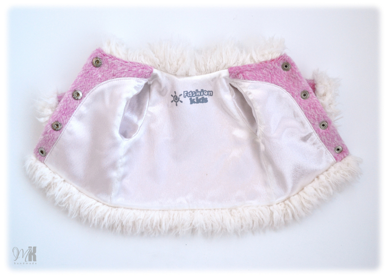 Пальтишко из розовой пальтовой ткани, застегивается на кнопочки. Воротник, отделка низа и рукавов - мех.