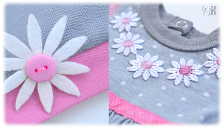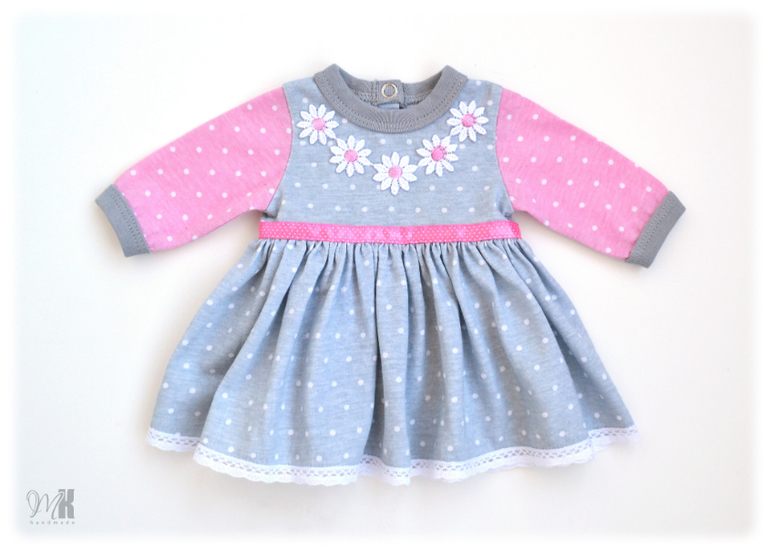 Платье из кулирки х/б в горошекдвух видов, застегивается сзади на кнопочки. Кокетка украшена цветочками, пояс - атласной ленточкой, а подол - кружевом.