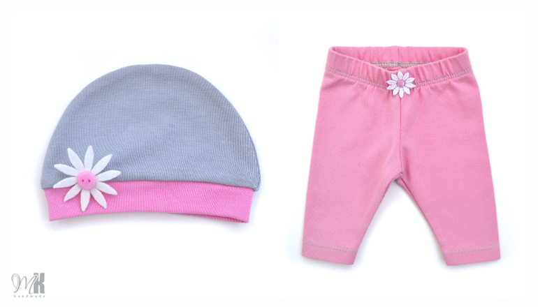 Леггинсы из розовой кулирки с/л, в качестве украшения - цветочек, как на платье. Шапочка декорирована цветком из фетра с пуговкой.