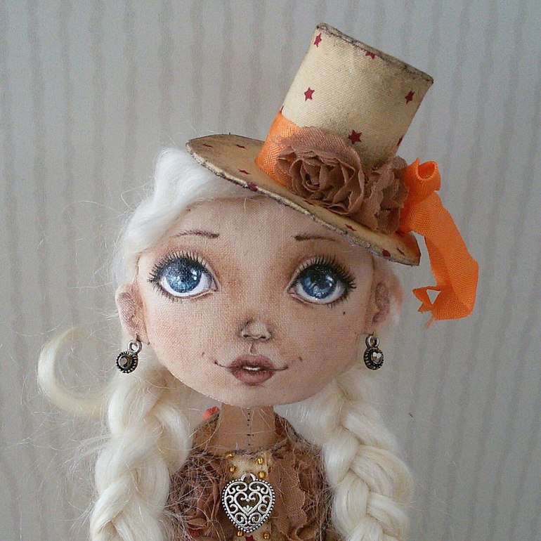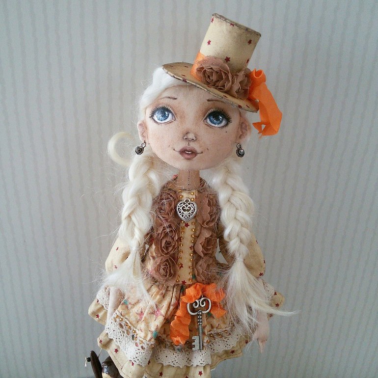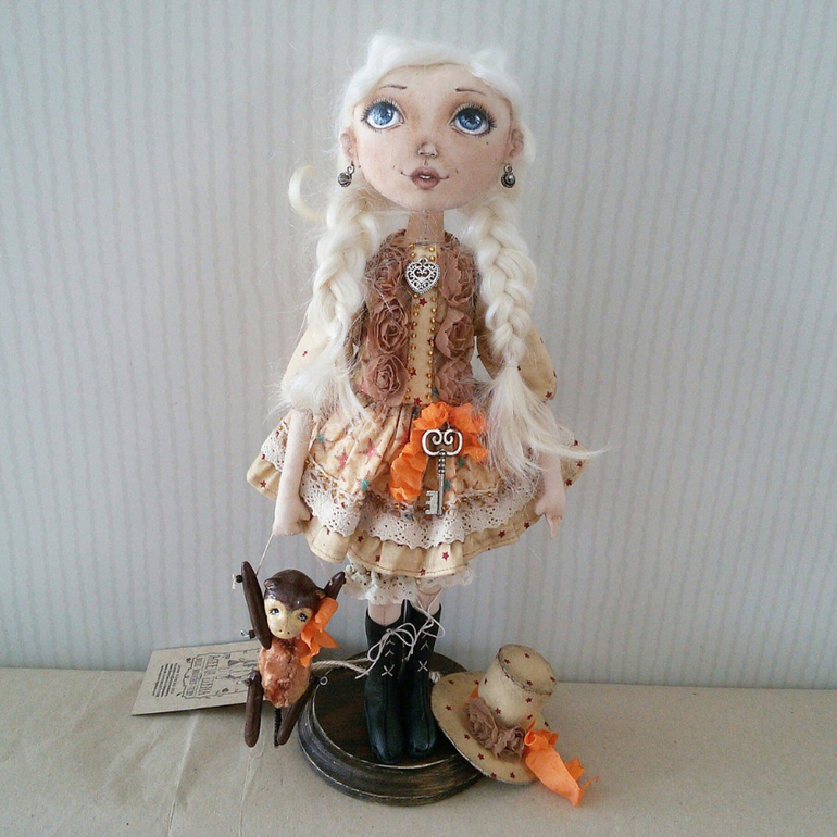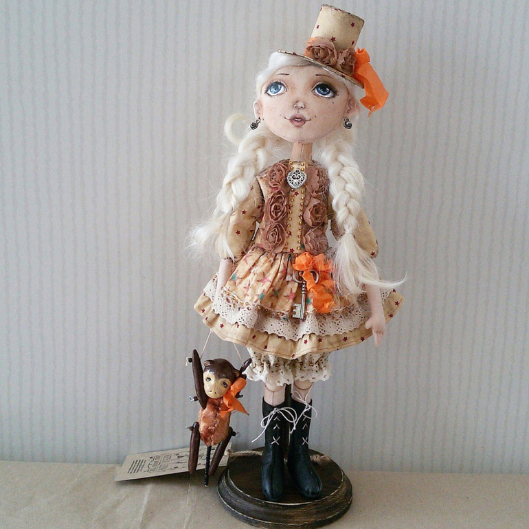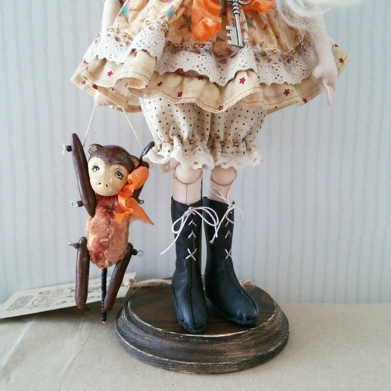 Алиса сшита из хлопка, личико расписано акриловыми красками и акриловым лаком. Волосы из шерсти козы. В локтях и коленях шарниры-бусины. Алису можно снять с подставки и посадить. Анфиса : тело- винтажный плюш и опилки, голова и лапы слеплены из La doll, расписаны акриловыми красками и лаком. Хвост - деревянные бусинки.