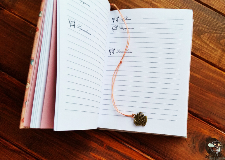 Книга формата А5, книжный переплет, листочки сшиты вручную. Обложка обтянута льном и хлопком. Внутри порядка 100 линованных листочков и 4 разделителя