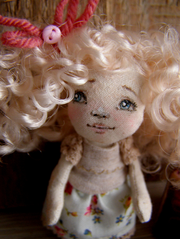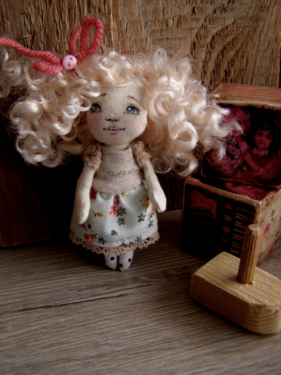 Игрушечный мир - животныеСовсем малышка.Белокурая девочка в ладошку...Сшита из небеленного хлопка..одежка из хлопка, хлопкового трикотажа и кружев. Под платьишком колготочки в горошек. Личико расписано акрилом и маслом.На спинке крепление под бронзу). Девочка-талисман. Она самый верный и настоящий друг). Внимательно слушает и умеет хранить секреты). Размерчик 8см. Немного подробнее под катом)