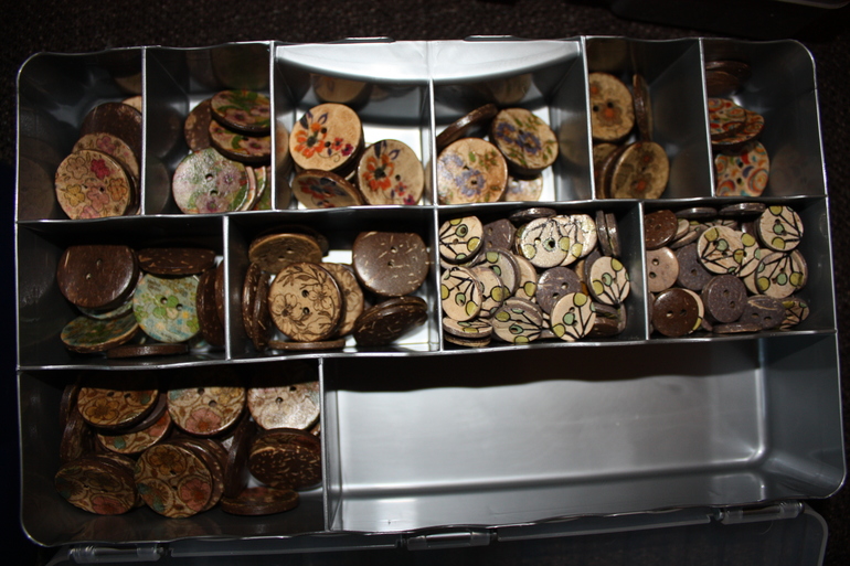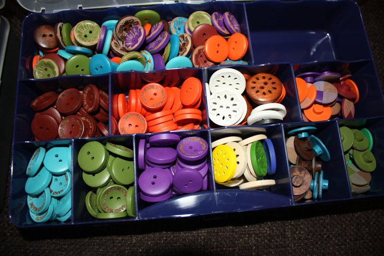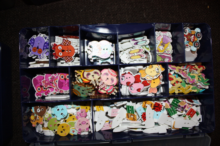 Остались правда пуговки, кот с рисунками детскими.. всякие животные, совы, цветочки и все такое. Но они у меня в миксах и их ну просто нереально разобрать по видам. Т.к. в одной ячейке будет по 2-3 пуговки ))) Так что пусть так и лежат с своих банках от Нутрилона ))))) Вот еще просто миксы пуговок, кот разделены просто по размеру..