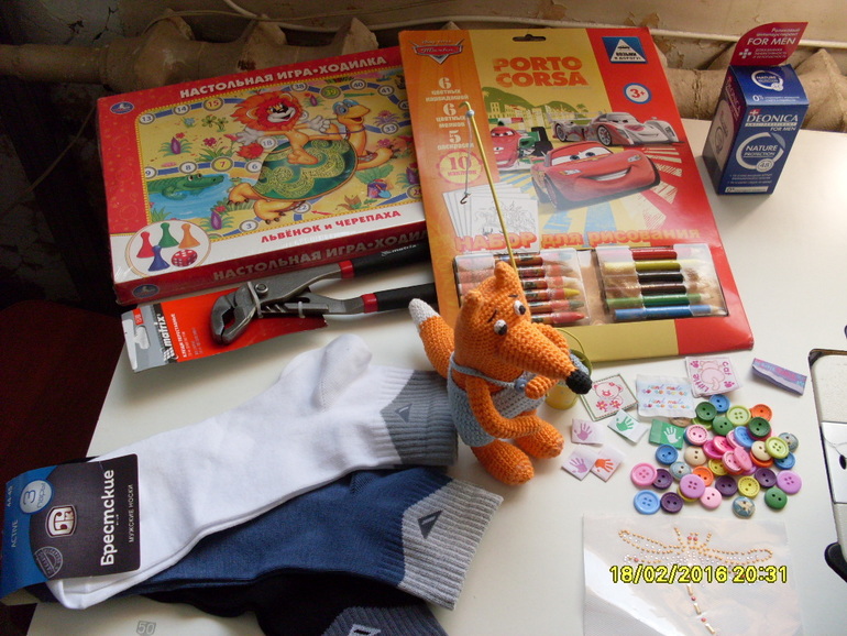 Вот такая чудесная и дружная компания собралась! ) А еще Димику Надя прислала разукрашку и игру (думаю,скоро мы до нее дорастем) Ну и папа наш не остался без подарков в предверии праздника!) Он стал счастливым обладателем ключа,дезодоранта и...правильно! носки!! Какой же праздник без них!))(думаю,он поделится с Юрой-размер одинаковый)) И даже мой хомяк получил подарочек-пуговки и бирочки) Наденька,спасибо тебе большущее за подаренное настроение!