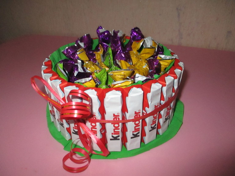 Состоит из 25 киндер шоколадок и 25 конфеток.
