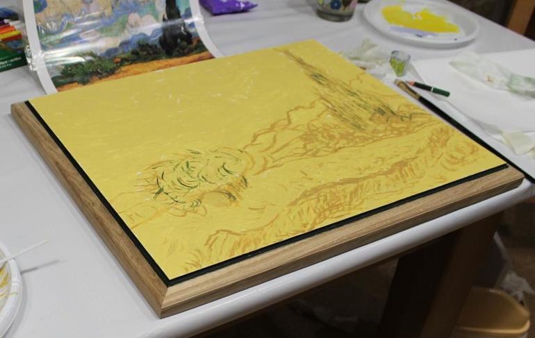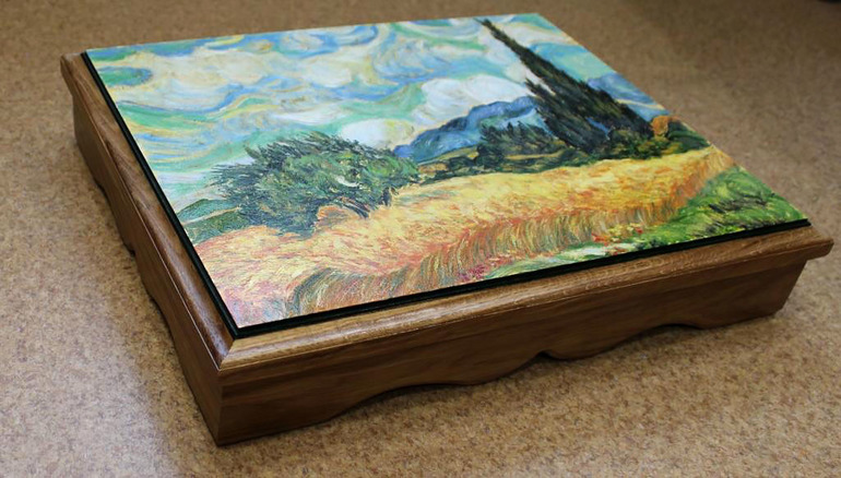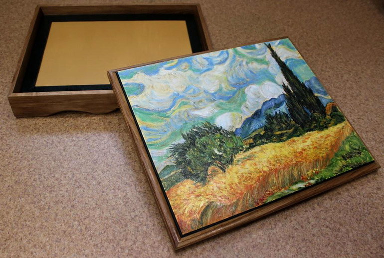 Я сделала магнитную подставку пшеничного цвета в темно-зеленой раме под цвет кипарисов - на ней будут собираться пазлы и дубовую шкатулку, на крышке которой акрилом я написала копию данной картины. Это моя вторая картина акриловыми красками!