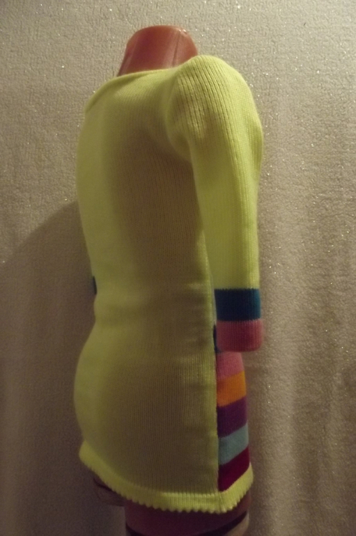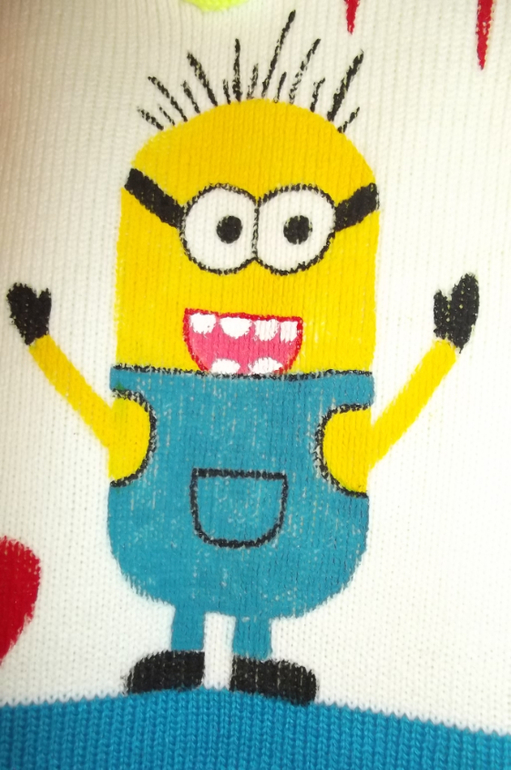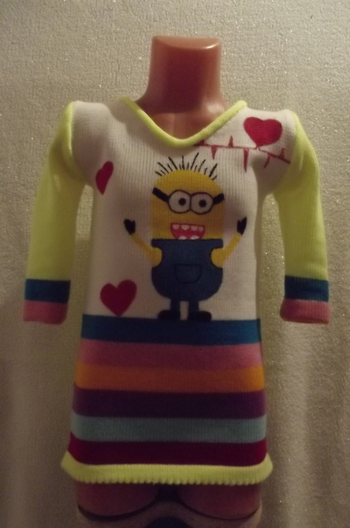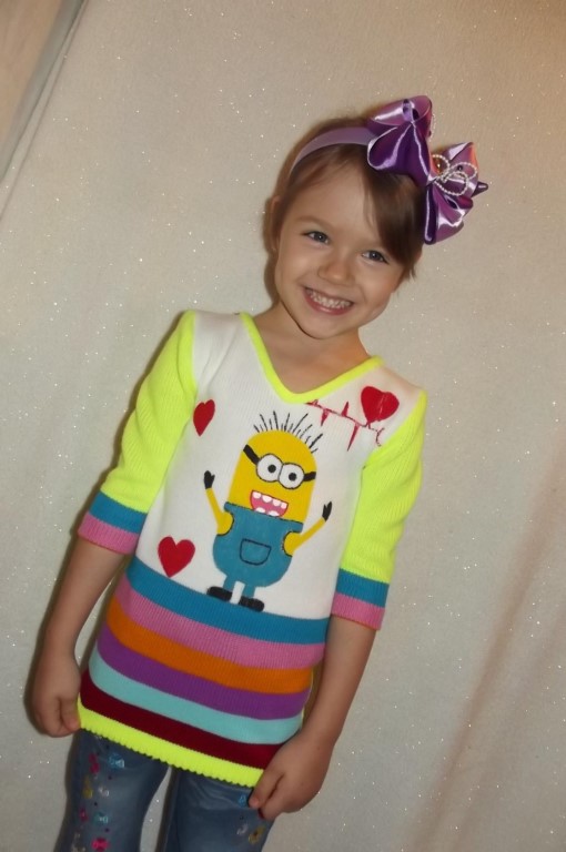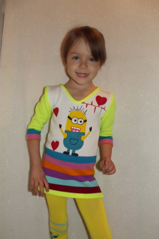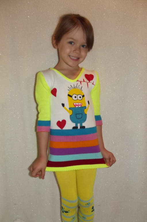 Машинная вязка (РАБОТЫ И СХЕМЫ)Был у нас трудный период,надо было дочке колоть уколы.Взамен ее терпения она попросила свитер с миньоном.Связала туничку и еще купила кофточку с миньоном.Полоски вязаные,миньон нарисован акриловыми красками. Много фото.