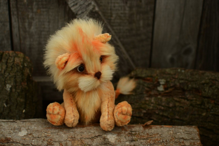 Игрушечный мир - животныеЛьвенок сшит из винтажного плюша и немецкого мохера, пяточки и ладошки миништоф, глазки стекло, мордочка оформлена стрижкой, тонирован маслом. Рост стоя 19 см, стоять не любит, сидит сам, приятно тяжеленький.