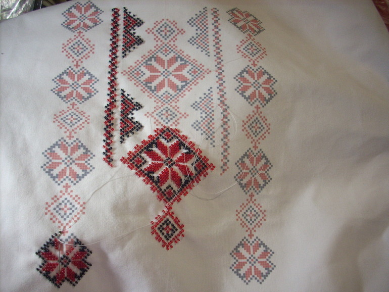 Вышивка картин. Крестиком, гладью, бисером, стразами, лентами, схемы по вышивкам, процессыПочему 8000 бисерин?, а потому что в процессе работы над изделием я пришила 5138 шт -красных и 2978 шт бисерин черного цвета. ( так гласит инструкция к заготовке). Вот такая получилась вышиваночка для девочки 5-ти лет. Вышита она бисером.В моих любимых красно-черных тонах на домотканом полотне.