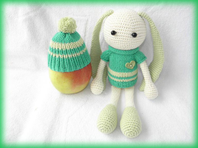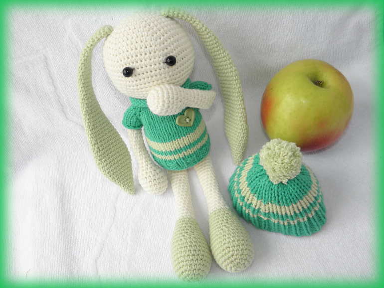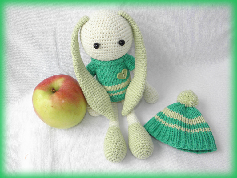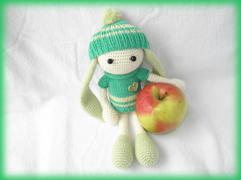 Так уже надоела зима и холода,хочется тепла и зелени листочков.Вот и родился у меня вот такой яркий зайчишка Грин)Любитель яблочек и приключений)