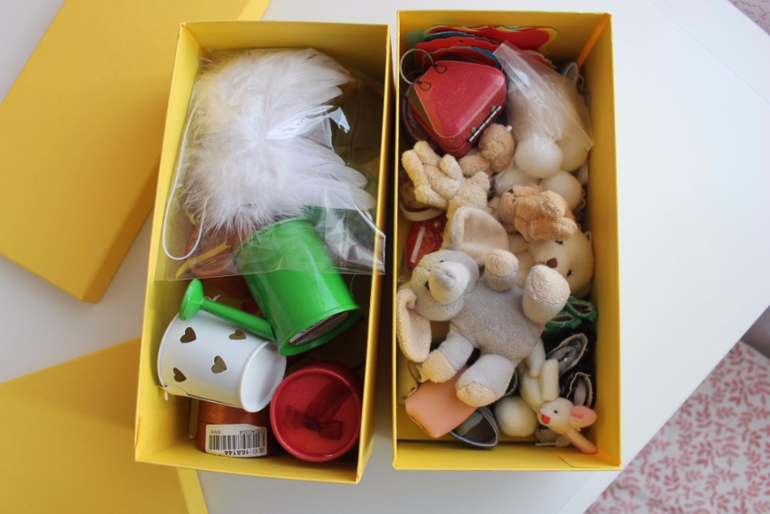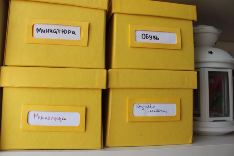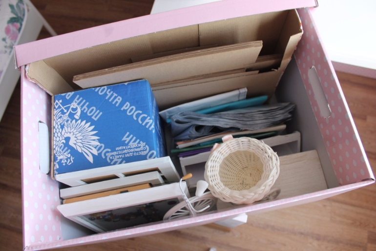 На стеллаже тоже стоит большая коробка, в ней хранятся коробочки для кукол, почтовая упаковка и прочее.