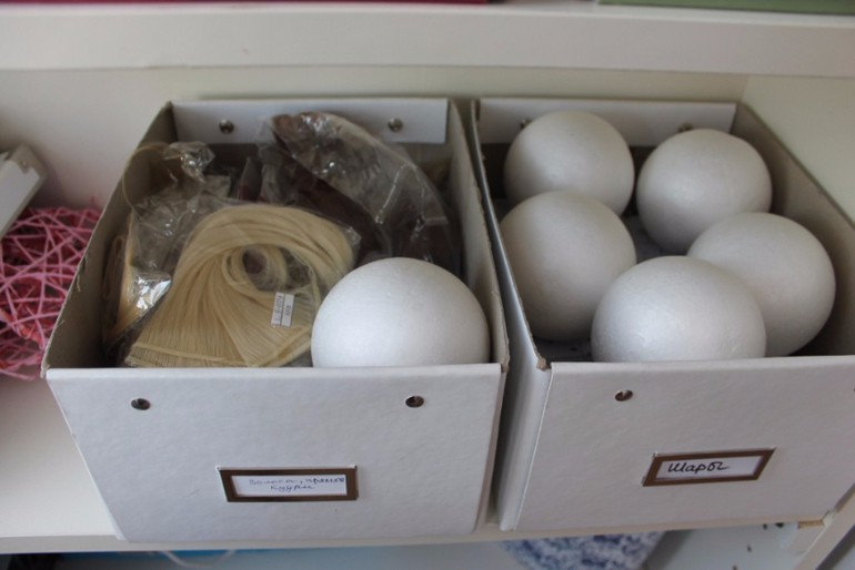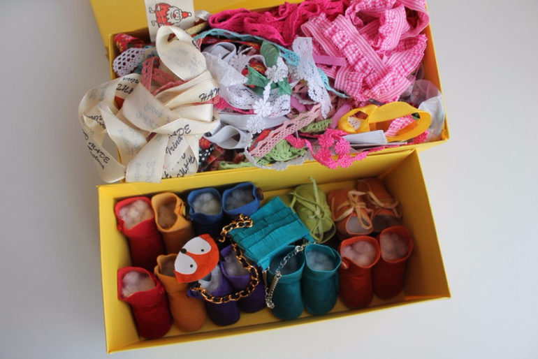 В зеленых хранится замша и клей для обуви куколкам. А так же фатин и широкое кружево.