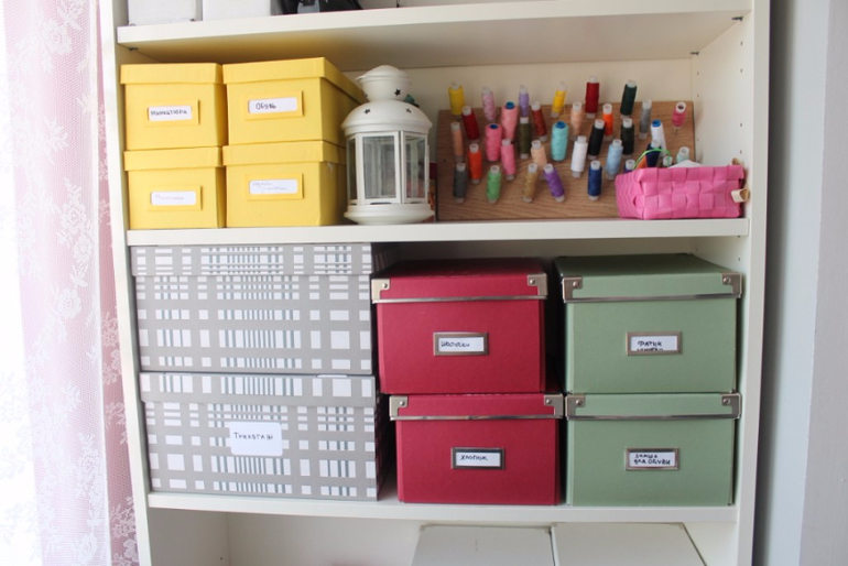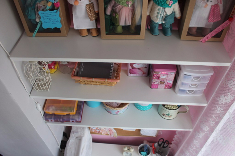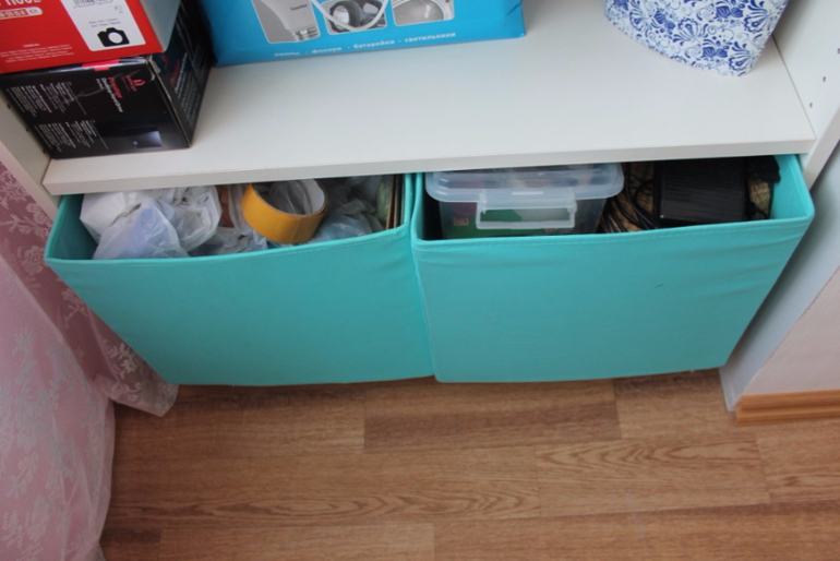Бирюзовые короба не совсем по размеру стеллажа. Но им я пока замену не нашла. А хранят они в себе много нужного: канцтовары, большие отрезы ткани, редкоиспользуемые материалы.