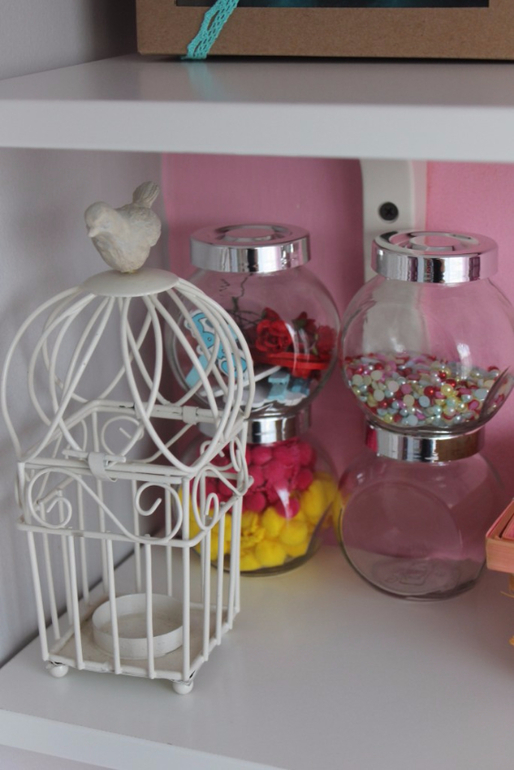 В стеклянных баночках разная мелочёвка, тесьма с помпонами, полубусинки для декора.