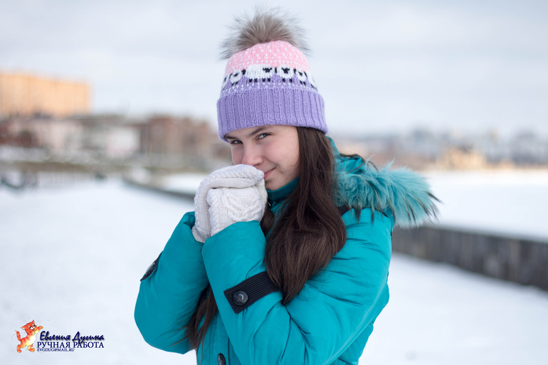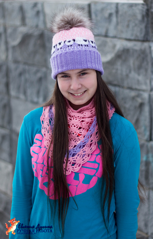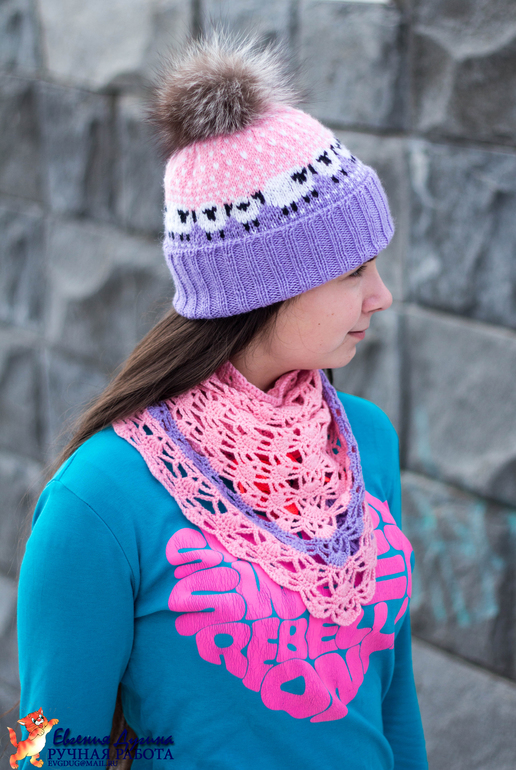 Овцемания захватила и меня))) Дочь сразу начала пищать, что ей просто жизненно необходима эта шапка) Вязала из того, что было, специально пряжу не покупала. А в комплект к шапочке связался бактус. Особенно радует то, что пряжа ушла полностью) Пишу в категорию "спицами", потому что это было сложнее.