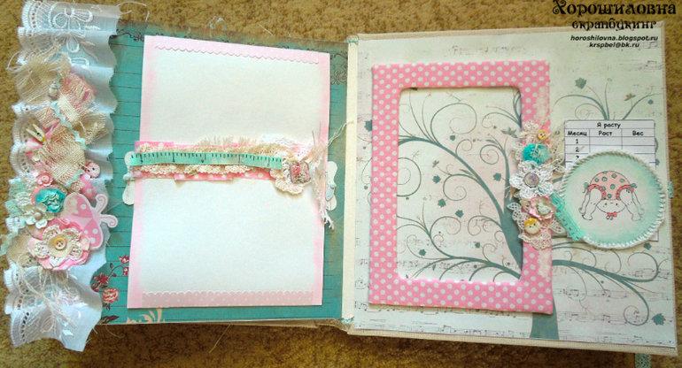 СкрапбукингАльбом для девочки по СП Тани Лысенко. Формат 25х25, 5 разворотов, рассчитан на 60 фото формата 10х15, 1 фото А5 и виньетка для фото по месяцам, куча кармашков, теги для записей, карточки роста, есть самодельные украшалочки. Внимание, фото очень много:-).