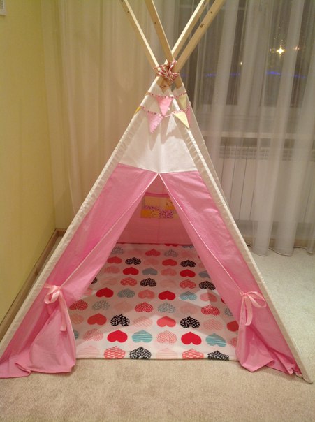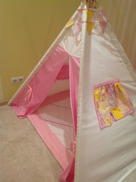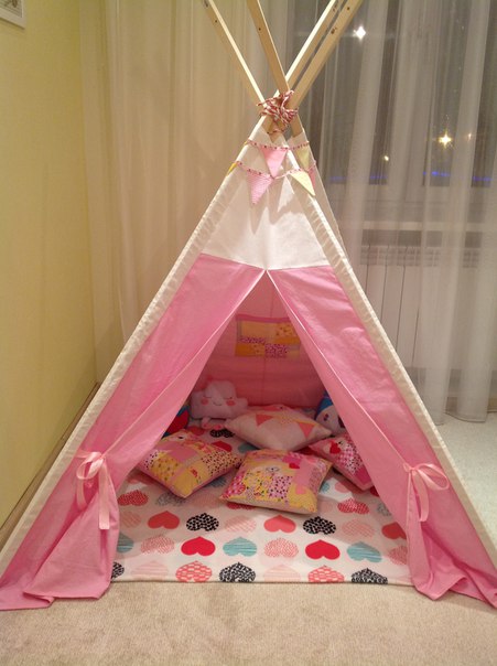 Шитье одежды, выкройки, ремонт одежды, шторы, швейные машины (уже приобретенные)Доброе утро, девчонки. Сшила вигвам для дочки. Осталось еще матрасик и подушки сшить) Шторки и карман на задней стенке из лоскутков. Заказала ткань для вигвама, но не дождалась, задерживают, но у меня терпения нет долго ждать, раз загорелась, надо сшить))) Вот свекровь отдала ткань из своих старых запасов, бязь розовую и белую, правда шириной 90 см, пришлось сшивать. Пакли муж купил в леруа (около 30 р за штуку). Сверху украсила флажками из той же ткани, что и карман со шторками. Размер вышел по матрасу 135 на 135. Довольно большой получился вообщем. Дочка довольна, вчера хотела там даже на ночь спать) Еще нужно гирлянду тайскую заказать, а пока повесила гирлянду с елки, вечером при выключенном свете очень уютно. Много фото под кат.