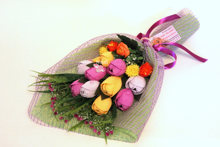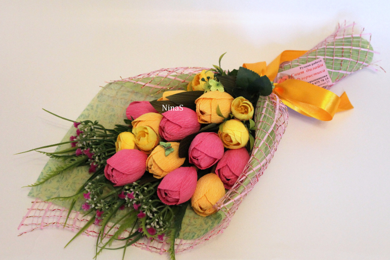 На встречу выпускников еще были мои любимые тюльпанчики, часто делаю такой букет.