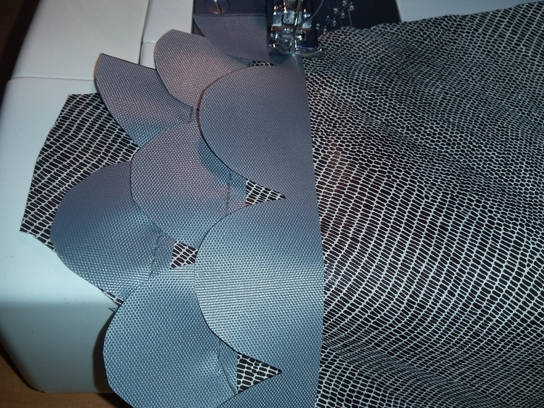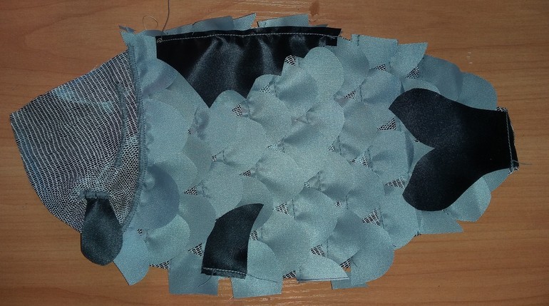 Пришить чешую на обе половинки. Отстрочить зигзагом жаберную кость: