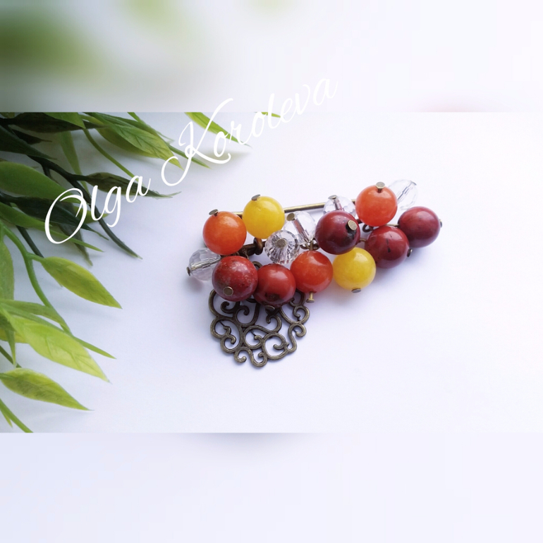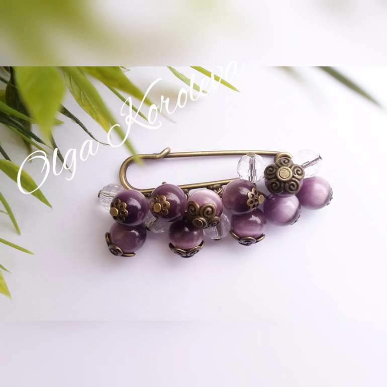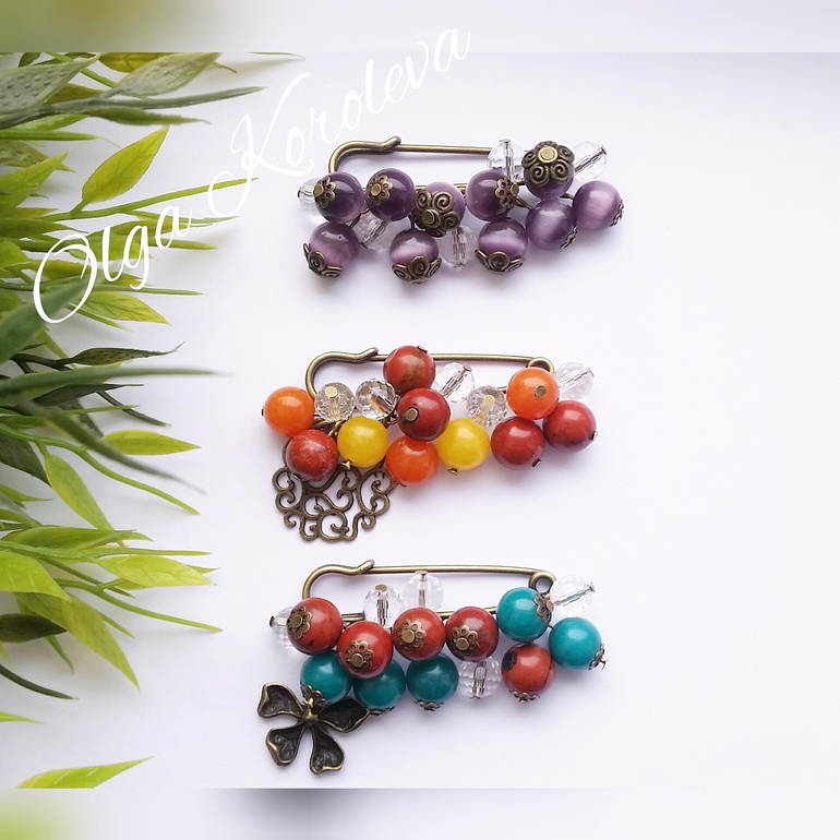 Фиолетовая брошь с кошачьим глазом, вторая и третья - тонированный агат и красная яшма.