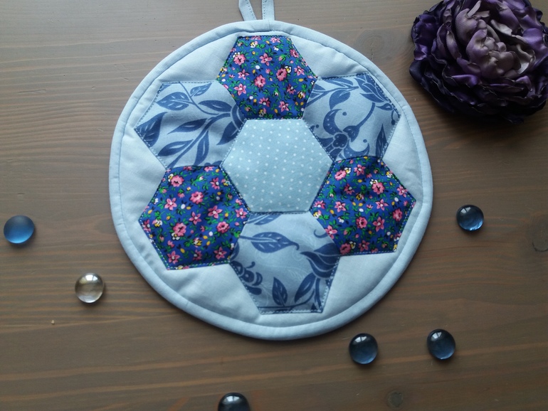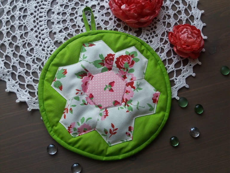 А я от зелененькой в восторге))) Скажи, ты шьешь круглую прихватку, обшиваешь косой бейкой, а сверху настрочиваешь гексагончики, сшитые вручную и уплотненные флизелином? Или не так?