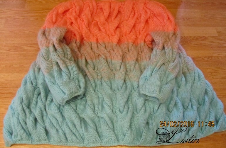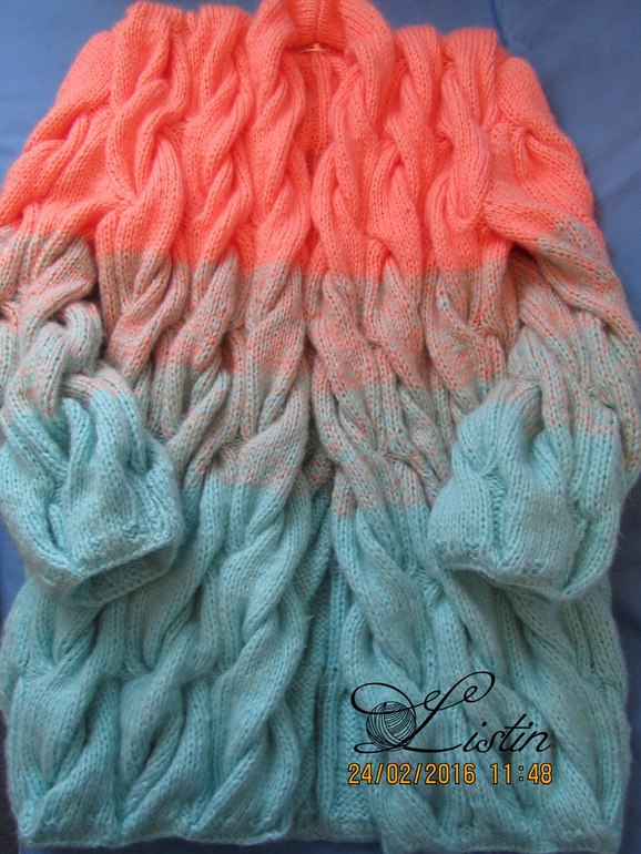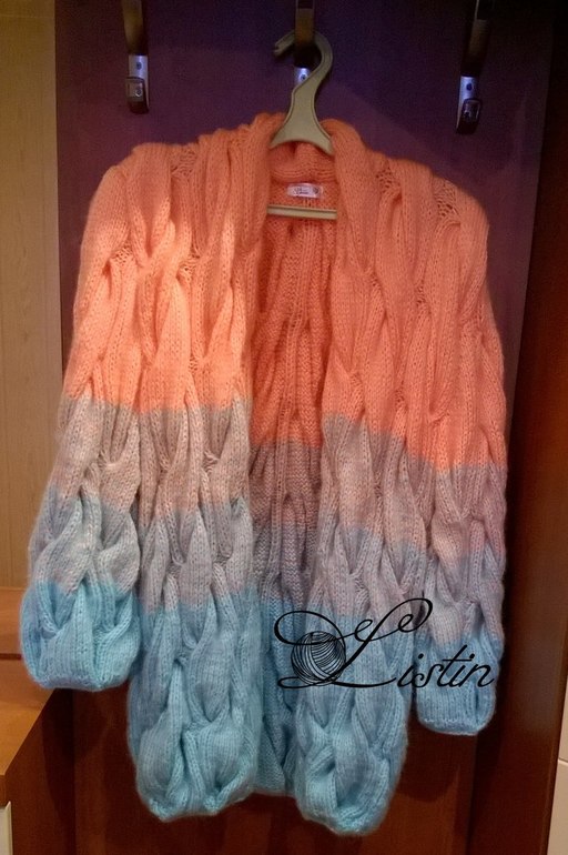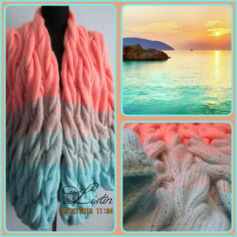 Я к вам опять с пухляшом в стиле Лало. Обозвала его "Лазурный берег" просто потому что цвет голубая лазурь напоминает море. Кардиган связан из ангоры с акрилом. Длина 85 см.
