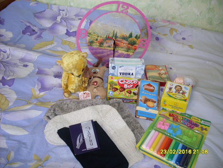 Во первых,это носки! Почему,во первых?) Потому что в своем доме зимой это очень необходимая вещь!))Шерстяные,мягонькие.. Юля,бабушке низкий поклон! Декупажные часики-нежный прованс..уже тикают в зале.)Мне досталась еще декупажная обложка на паспорт и кружавчики с пуговками хомячку.Ну и Димику краски,пластилин и сладости(уже съедены) Пусть вас не смущает коробочка с надписью *Водка*-это конфетки))) нашему папе) И в завершении,еще один персонаж...
