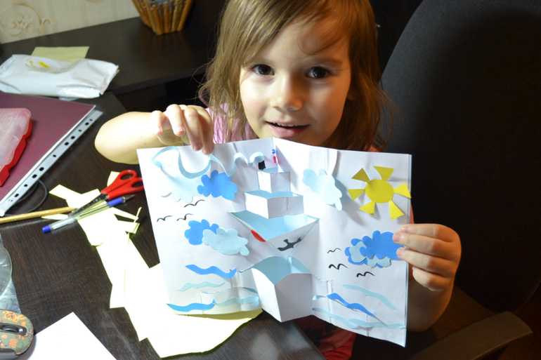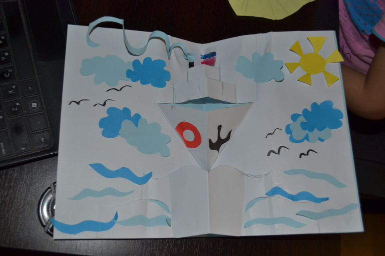 Детеныш все сдалал сам, только облака я вырезала и птичек дорисовала, потому, что у дочи уже терпения не было, она уже показывала приемы карате, у нее быстро внимание с объекта на объект перескакивает. Спасибо, что и на это терпения хватило :))