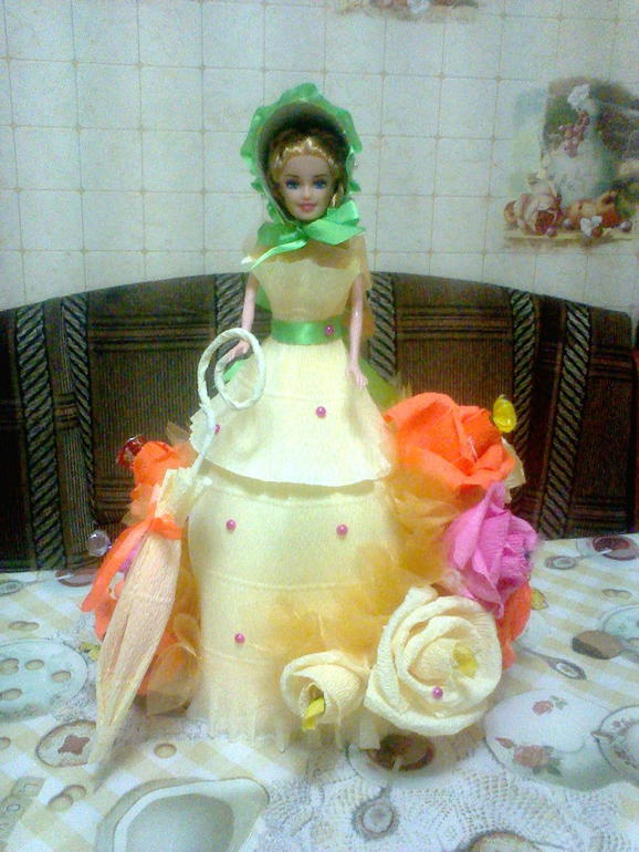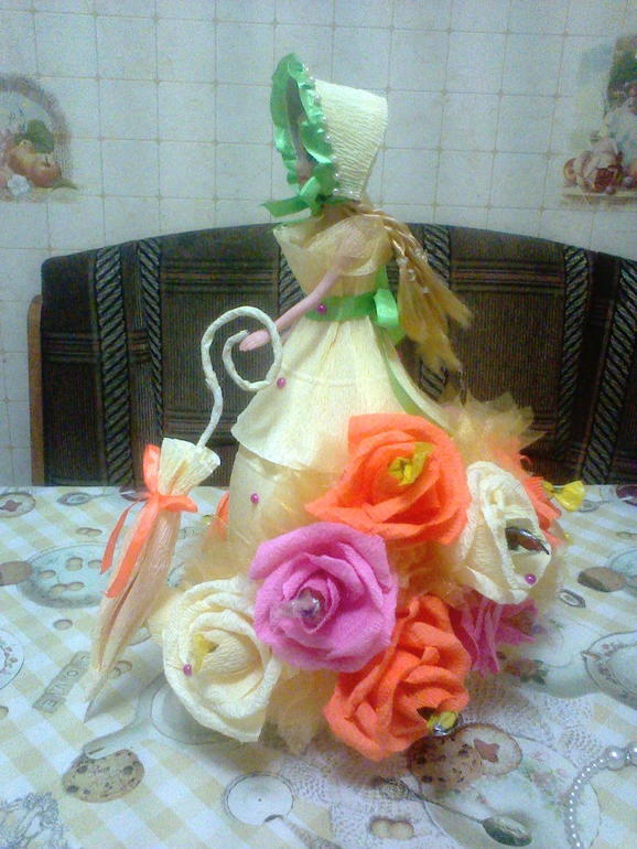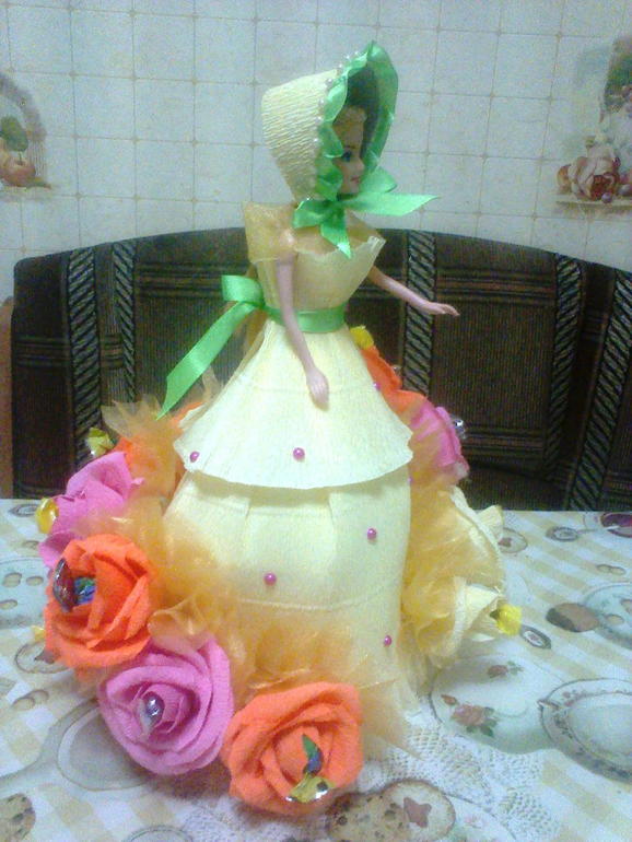 Букеты из конфет. Свитдизайн.Сотворилась у меня куколка с конфетами. Конфеты взяла "Бешеная пчелка " и карамель с соком. Критика принимается.