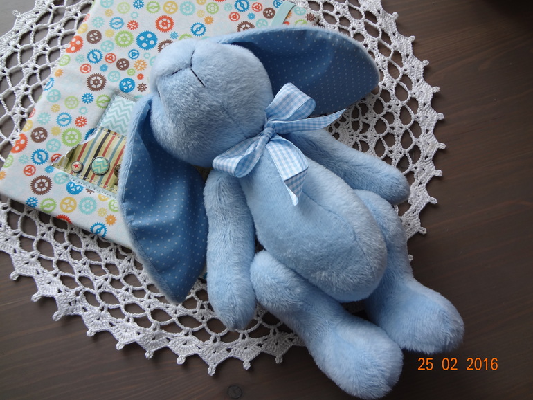 На этот раз в голубом цвете. Рост 28см,такой упитанный мальчишка получился!!. Сшит из плюша и хлопка,набит синтепухом. Ручки и ножки подвижны,голова крепко пришита.
