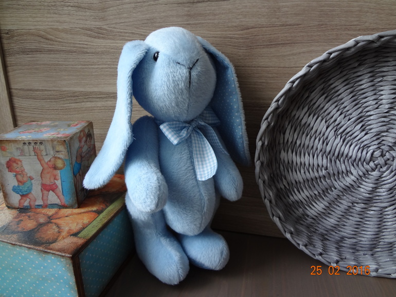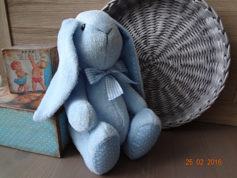 Игрушечный мир - животныеНа этот раз в голубом цвете. Рост 28см,такой упитанный мальчишка получился!!. Сшит из плюша и хлопка,набит синтепухом. Ручки и ножки подвижны,голова крепко пришита.