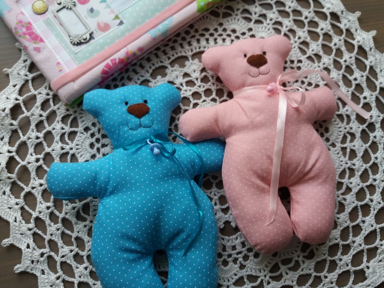 Игрушечный мир - животныеЕще парочка мишек, мальчик и девочка.Мишутки сшиты из хлопка, набитв синтепухом.На шее ленточка с сосочкой.