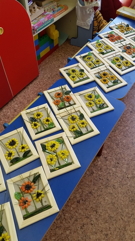 Цветы делали из макарон, детки делали сами.