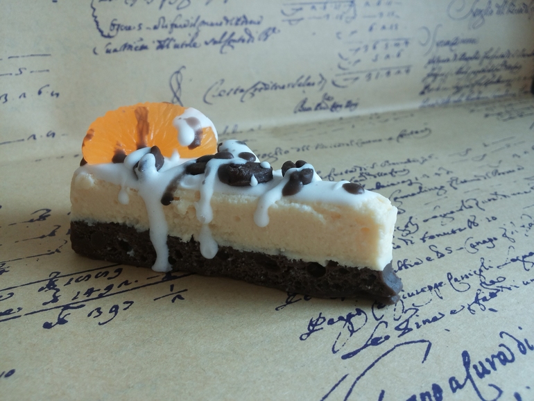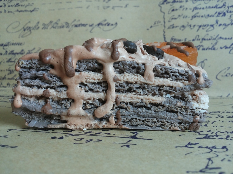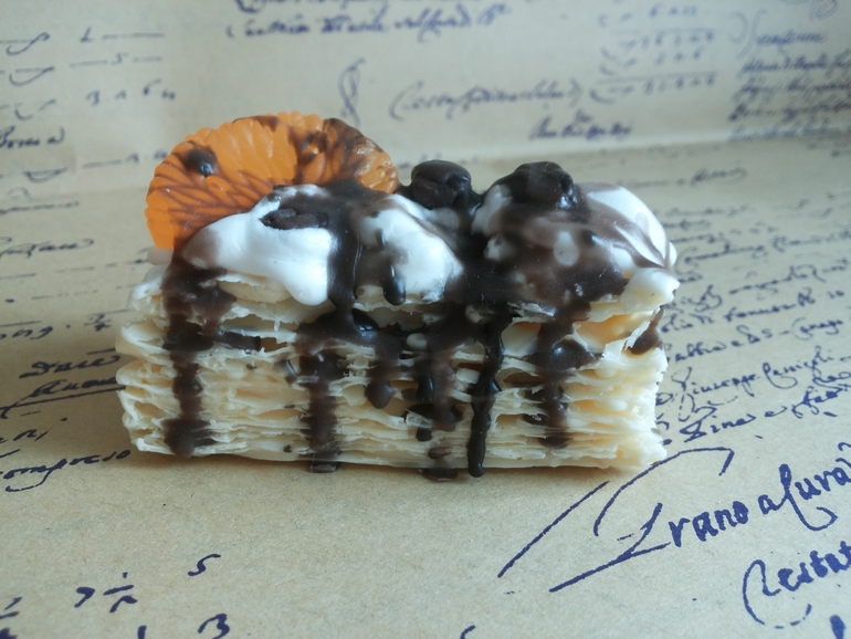 Да, слоеное тоже из силиконовой формы. Я долго не могла купить силиконовую форму пирожного наполеон и купила силикон и настоящую пироженку. И вуаля))) А поскольку силикон продается литрами, то и кусочек торта я тоже сама отлила (из обычного куска хлеба)