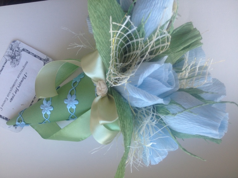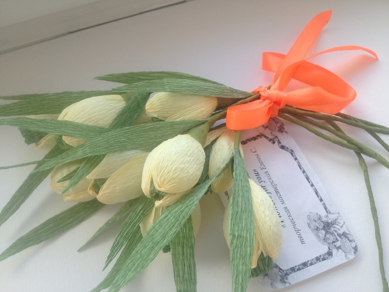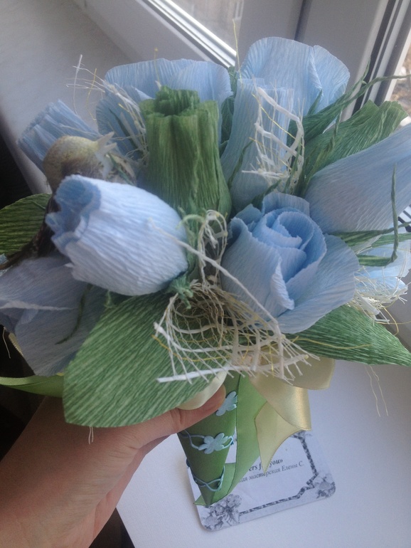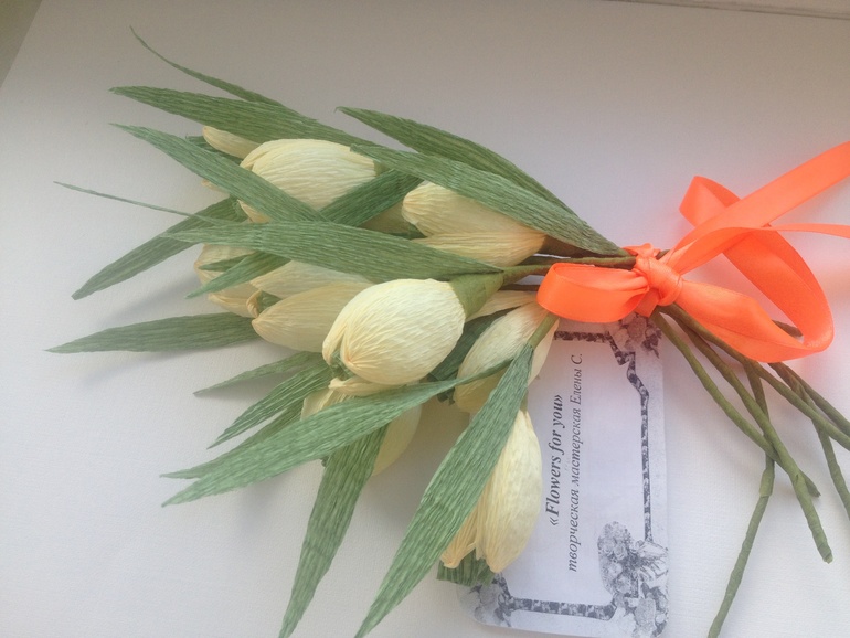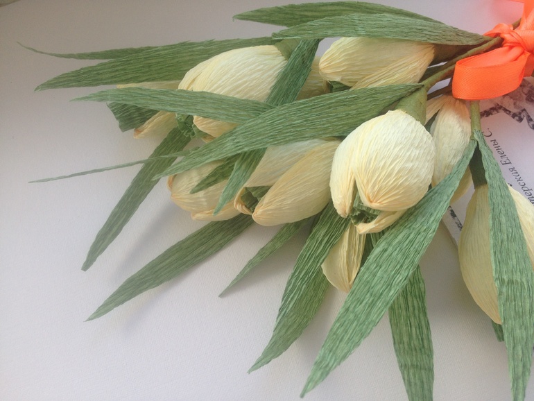 Добрый вечер, Юлия! Что хочу сказать, спасибо за мнение. Тюльпаны, вообще я делала подснежники)), оформила в кулечки, я так и хотела сделать изначально, очень здорово смотрятся, а букет из роз в реале лучше, чем на фото, чашелистики есть, но небольшие, с яркими элементами декора согласна, буду пробовать