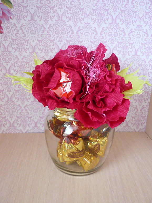 Букеты из конфет. Свитдизайн.Такую конфетницу я сделала за час, нужна лишь простая банка, железная крышка и пару тройку гофрированных цветов, можно с конфеткой можно без нее. На мой взгляд классная идея подарка на 8 марта. И цветы и конфеты. Идея не моя и не новая