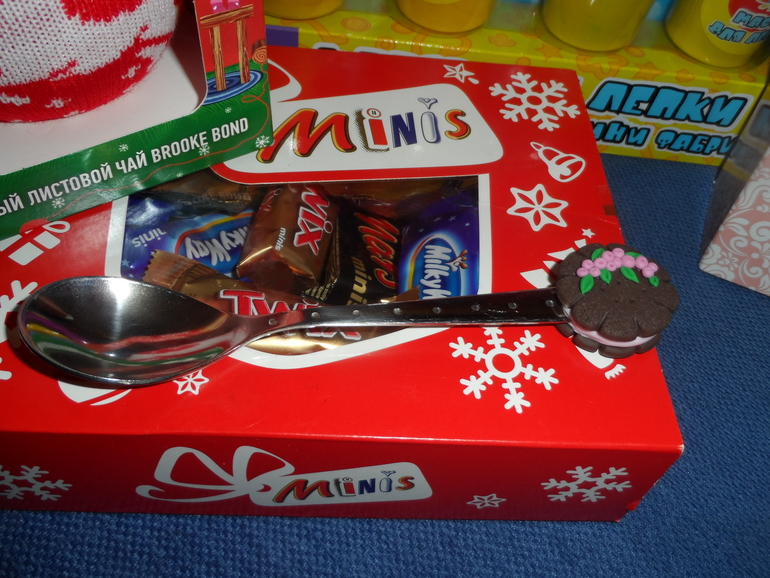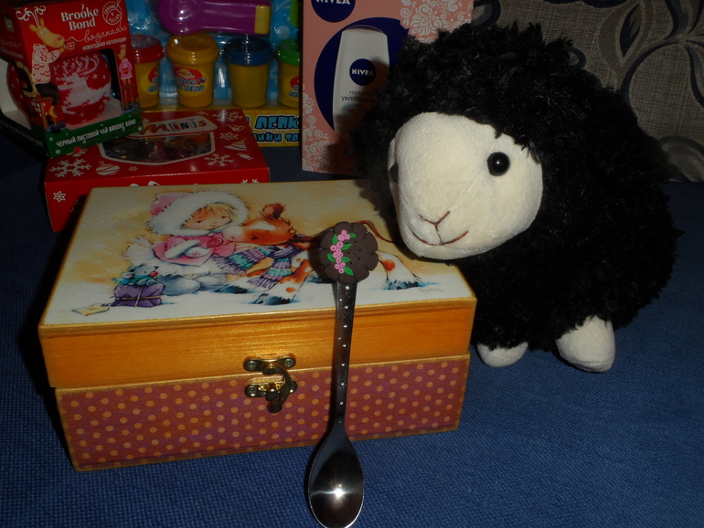 Тут виден чай новогодний, в вязаной одежке. Гель для душа, для меня( очень кстати пришелся) а то я совсем обеднела, никак денег на себя не выделю...