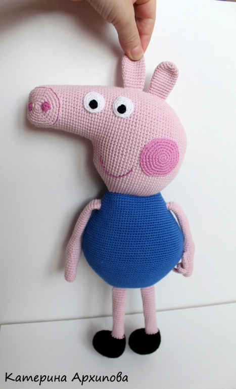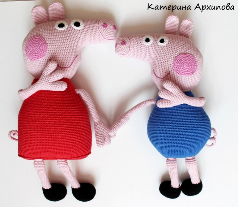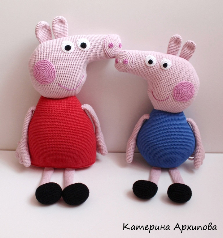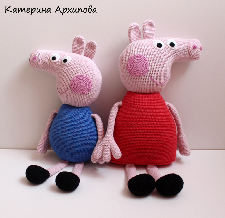 Вязала я их реально долго...Рост у Пеппы 43см, Джордж 37см. Мне пришлось аж в первые купить МК Марии Уфимцевой,чтоб кое что подсмотреть,хотя схему всё же сама делала,так как у меня они большие,я же не люблю маленьких