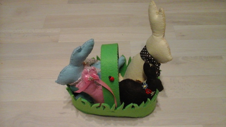 и всего то часок на задумку и выкройки и один фильм с Дикаприо на шитье))) Ну еще часок на доделку корзин украшения. Правда у меня фетр только толстый и трудновато с ним работать. И еще прошу (недопрошусь) мужа вырезать подставки из тонкой фанеры для заек. Они плоховато стоят.