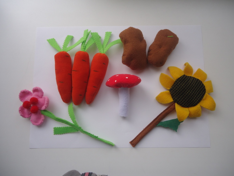 Развивающие игрушкиДавно хотела что-нибудь сделать из развивающих игрушек и тут увидела огород, не смогла пройти мимо, и тут получился не огород, а целый огородище (три морковки, две картошки, капуста, тыква, две редиски, два чесночка, капуста, кустик клубнички (клубнички съемные), подсолнух, цветочек и даже есть мухомор. В огороде помимо овощей есть еще две подружки: гусеничка-модница и червячок-весельчак.