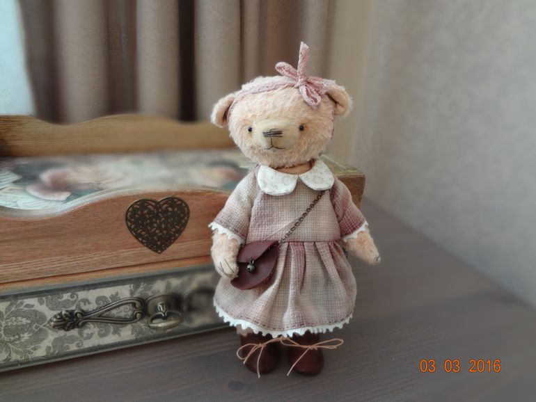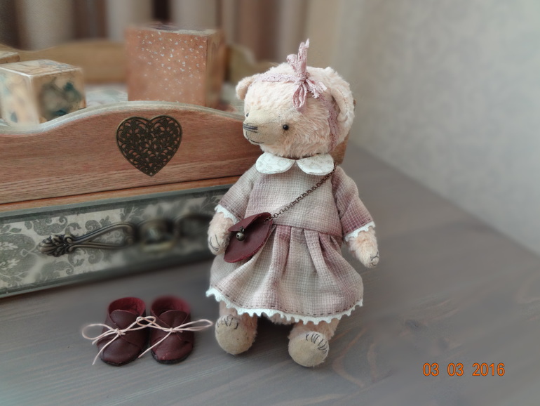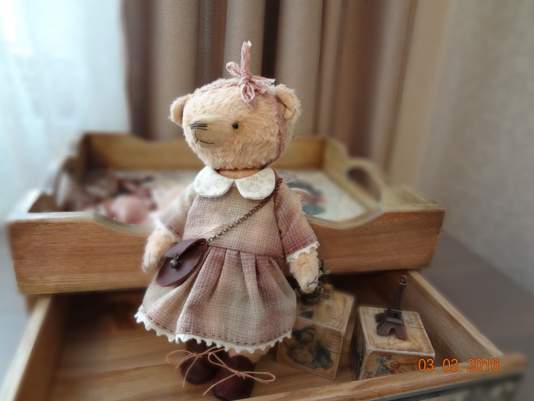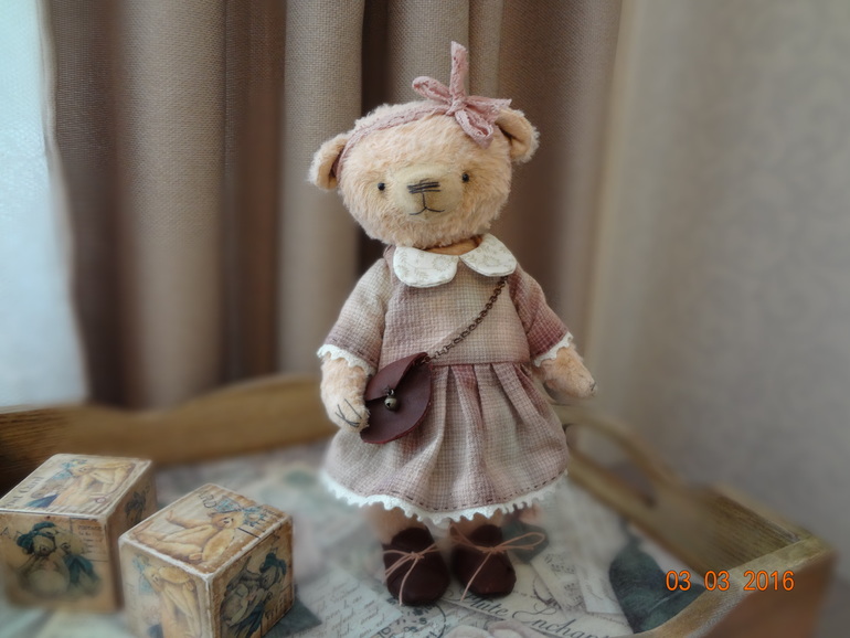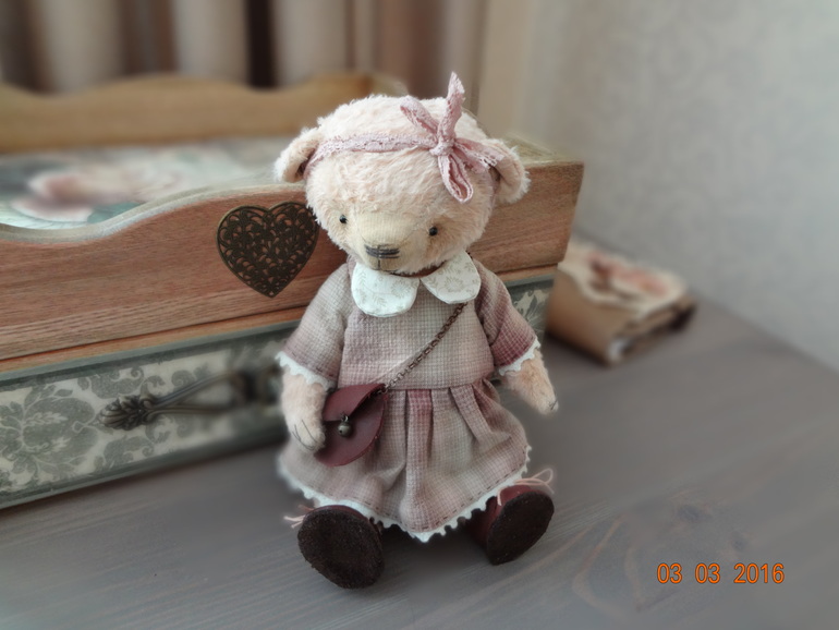 Тедди: мишки и их друзья.Сегодня спешу вам представить новую мишку тедди по имени Марта,в честь месяца ее рождения.Мишка сшита из немецкой вискозы,набита плотненько опилочками,утяжелена стальным гранулятом. Шплинтовое крепление,голова покачивается. Одета Марта в платье из японского хлопка,украшенное кружевом. Обута в кожаные ботиночки. Мишка сшита по новой выкройке.