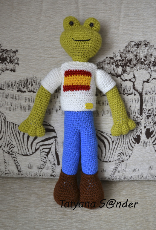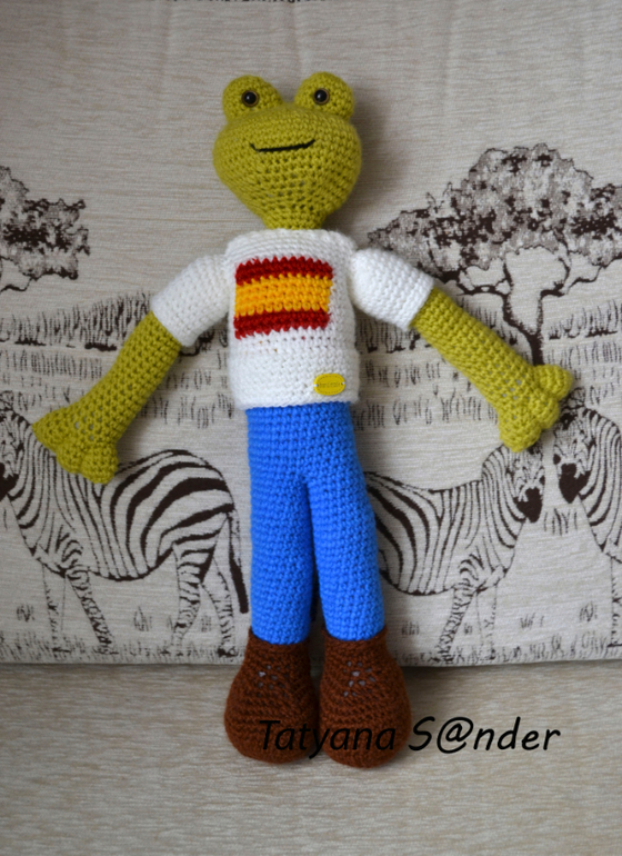 Амигуруми (вязаные игрушки)Вот такой лягушонок связался, ростом вышел 40см. Футболка немного приподнимается на руках и снизу. Пряжа использовалась разная: суфле, беби (германия), детский каприз. Крючок 3мм.