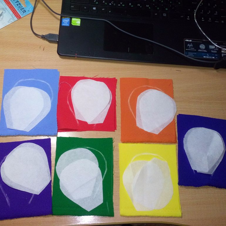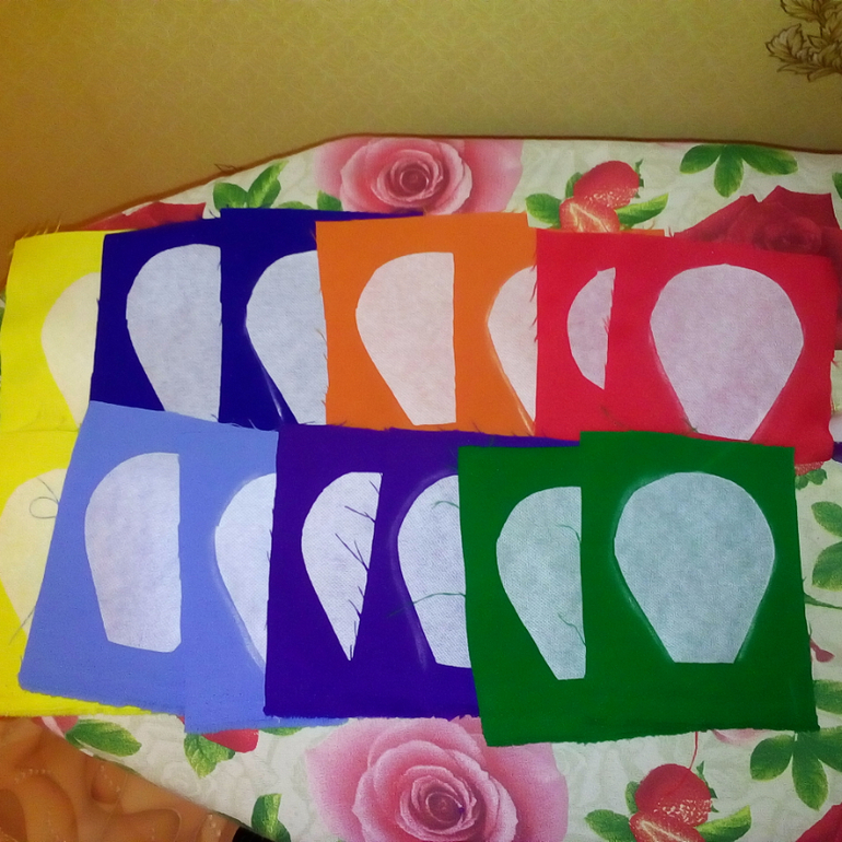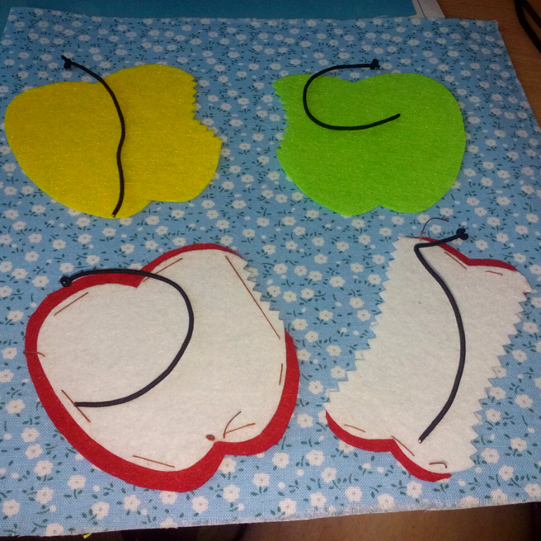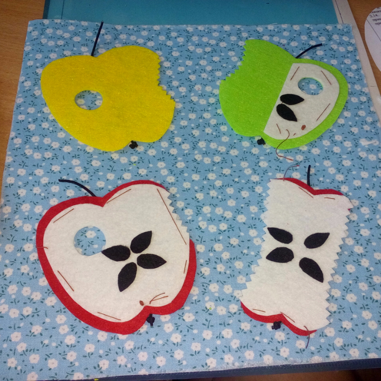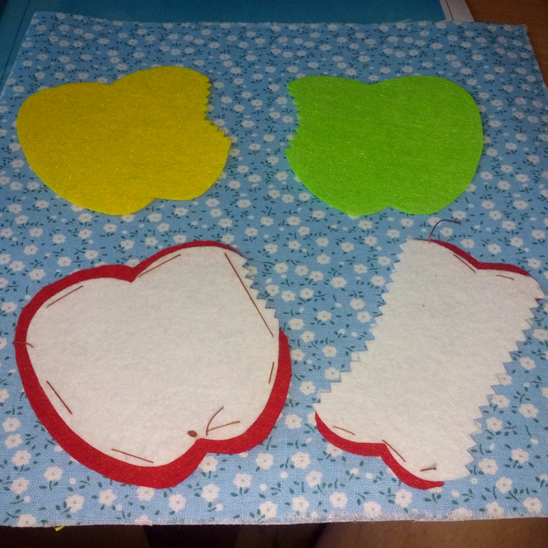13. Вырезала детали яблок, разложила на основе, чтоб проверить, все ли в порядке и соответствует размерам. Приметала составные части друг к другу.
