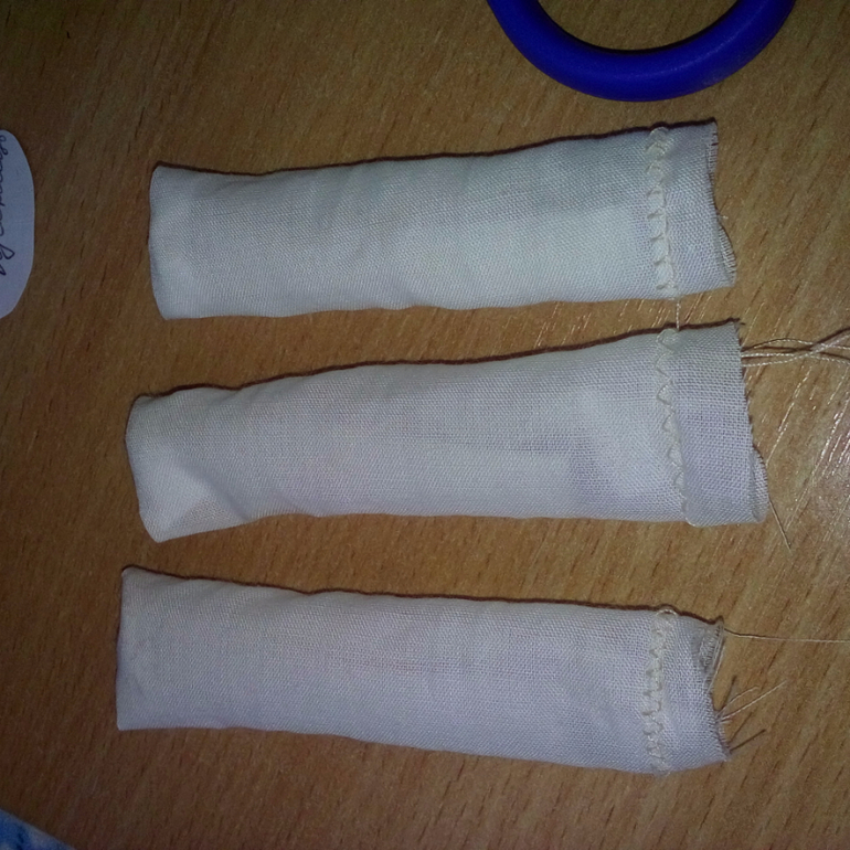 17. Сострочила, обметала туловище, вставила внутрь и зашила кусочек резинки, немного короче длины тельца. Прогладила.