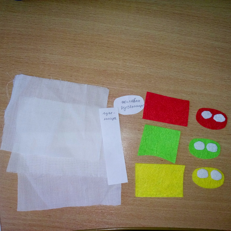 Материалы: фетр красного, светло-зеленого, желтого, белого и черного цвета, ткань всех цветов радуги (у меня габардин, ибо только его нашла во нужных цветах), белый хлопок для гусениц, пришивная кнопка, листочки, черная шляпная резинка, обычная резинка, силиконовая резинка, пуговицы, бусины, наполнитель для лепестков (холофайбер, шуршащий пакетик, перловая крупа, горох, бусины, бубенчик), флизелин.