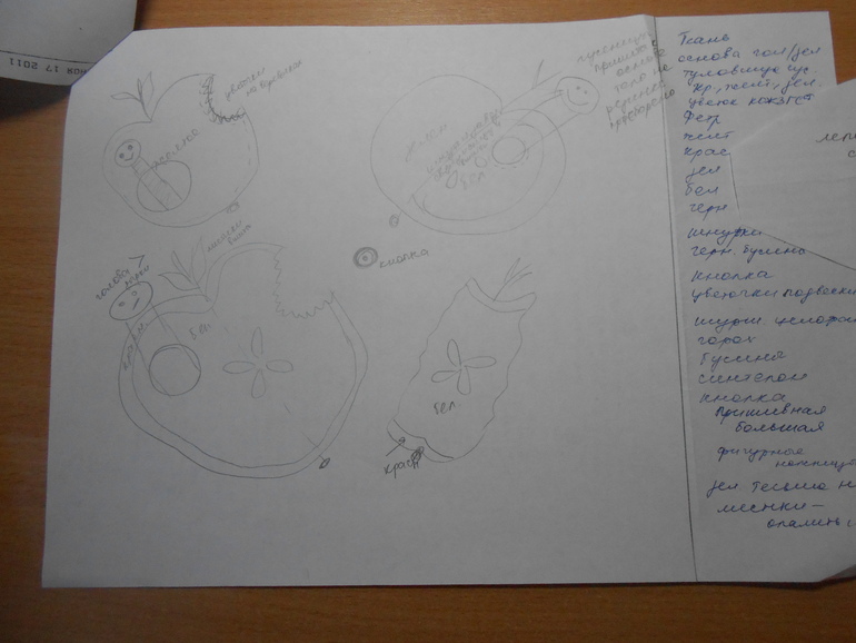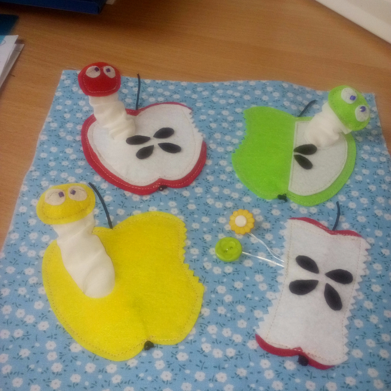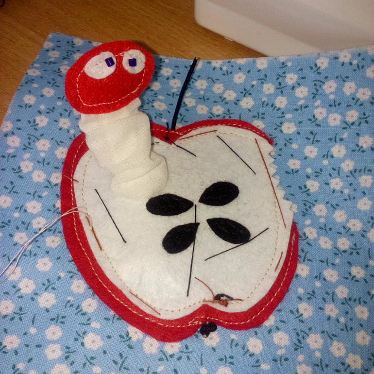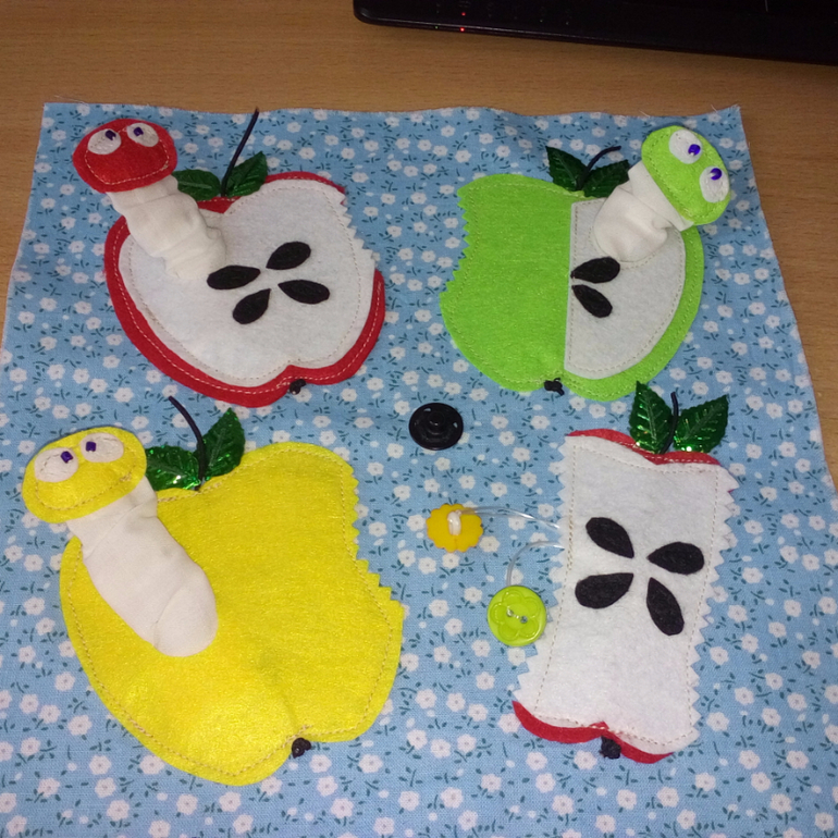 19. В яблочках вырезала отверстия для гусеничек, желтое яблоко продублировала флизелином, чтоб не просвечивало. Вставила гусениц, пришила за нижнюю часть, сверху приметала яблочки, предварительно вручную пришила семечки и вставила шнурок.