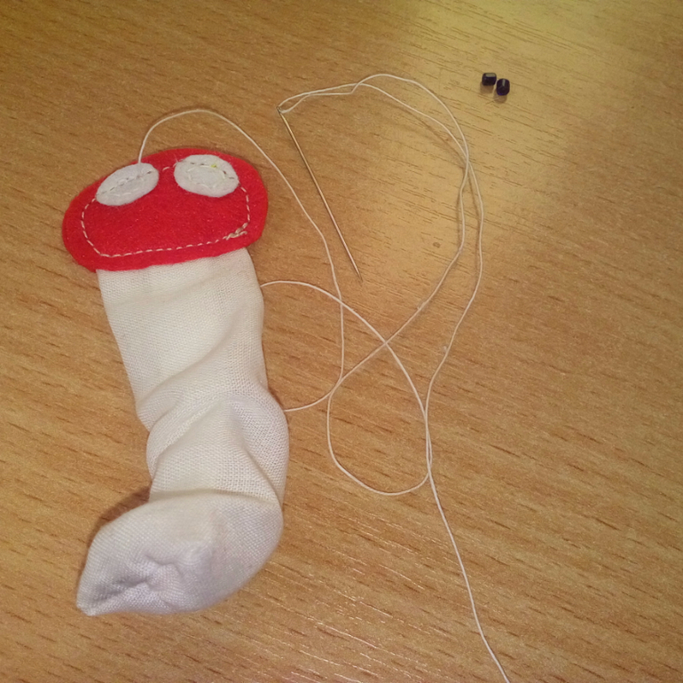 18. К 1й детали головки вручную пришила белый фетр для глазок и бусинки. Затем вытянула резинку, приметала тельце к головке, подложив и нижнюю ее часть. Сострочила.