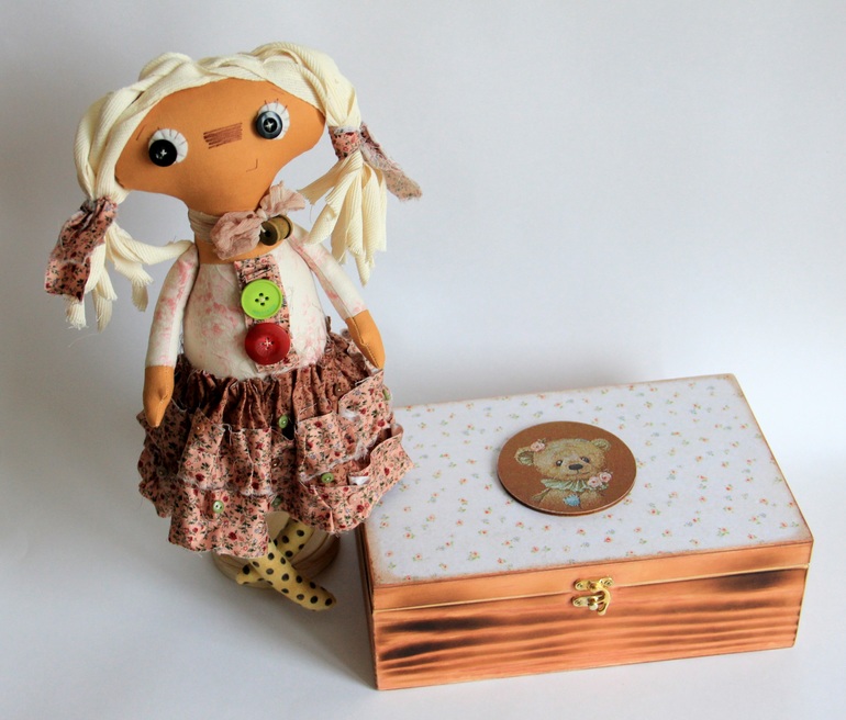 Куколка была не одна, а со шкатулкой для ниток, пыталась выдержать обе рукоделки в едином стиле: