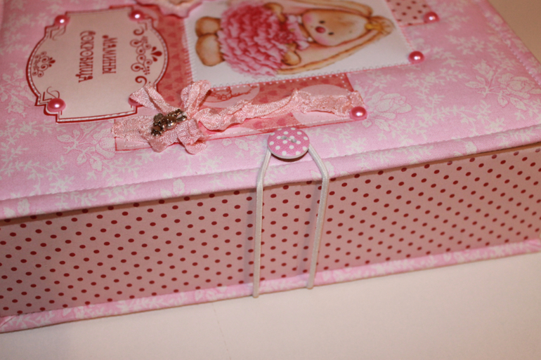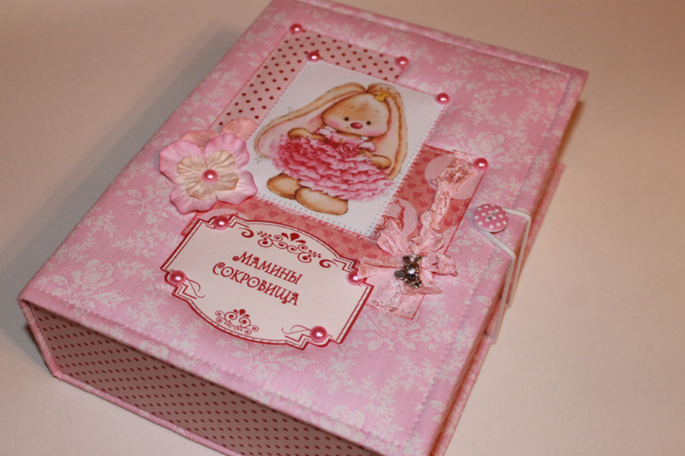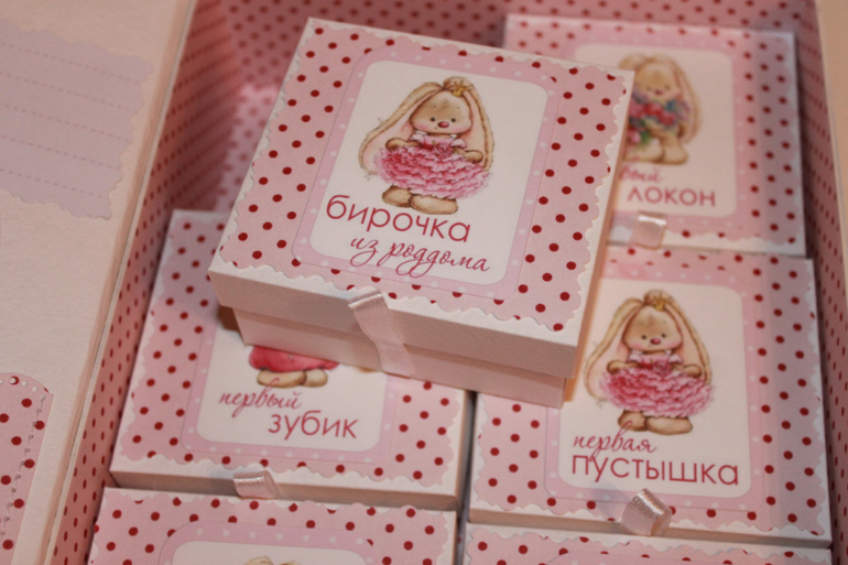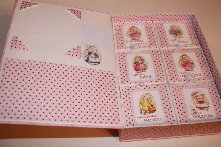 Теперь коробочка - размер 23*17,5*6см, внутри 6 коробочек 7*8см, высота 4см. Здесь также можно хранить блокнот Мамины заметки, места как раз достаточно. На крышке есть место для фото малышки и кармашек, где можно хранить фото узи