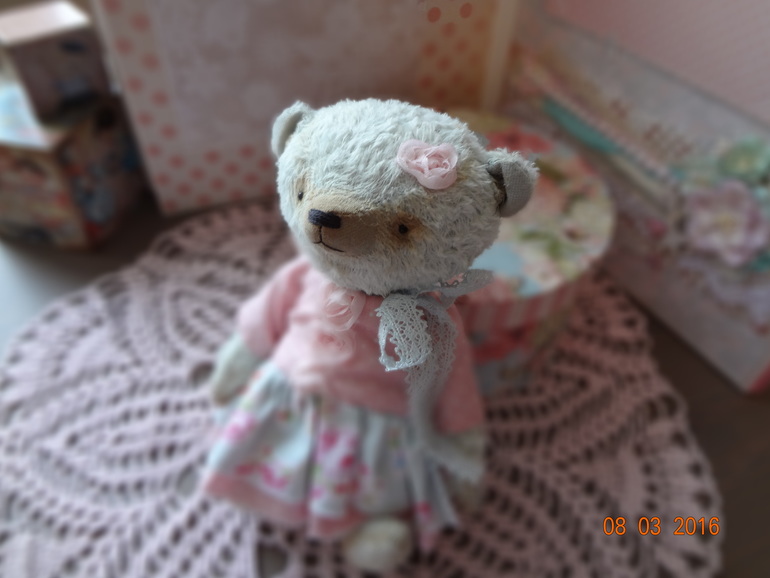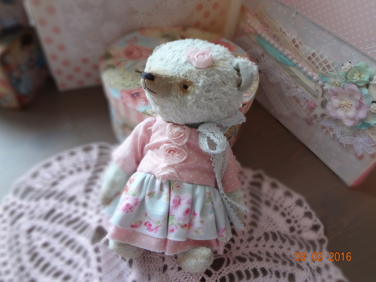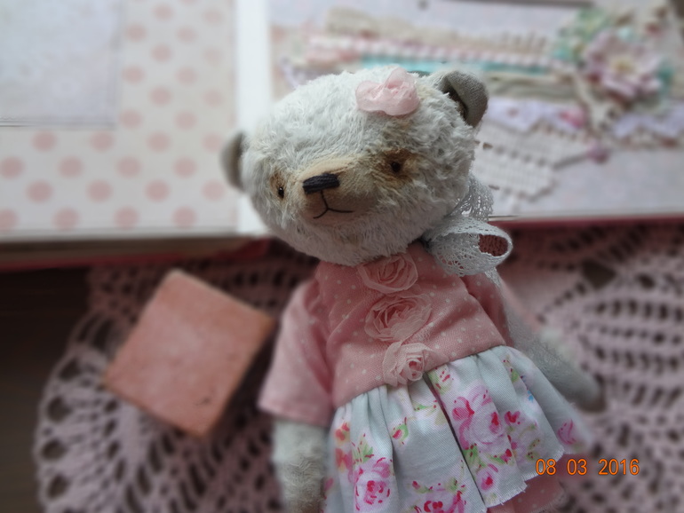 Тедди: мишки и их друзья.С 8 марта друзья!!!! Пусть вас вдохновение никогда не покидает!!! А у меня сегодня родилась мишка в стиле шебби шик.Сшита из вискозы,набита плотненько опилочками,утяжелена стальным гранулятом. Шплинтовое крепление,голова плавно покачивается. Мишутка одета в платье из хлопка,украшенное кружевными розочками. Сшита полностью вручную с большой любовью и теплом. Мишка станет прекрасным украшением комнаты в стиле шебби-шик.